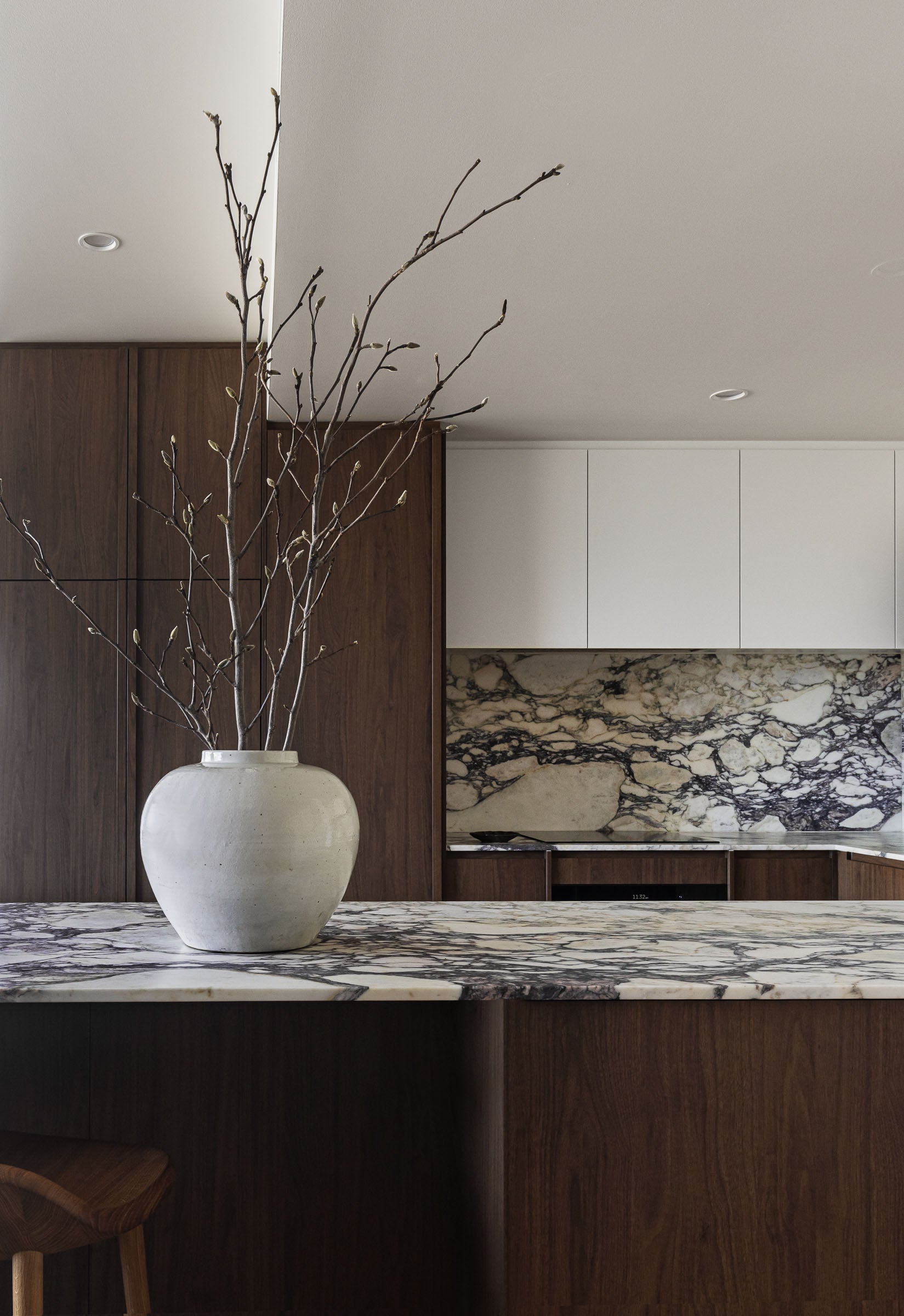 Dark and light are balanced in this contemporary home, with vertical lines drawing the eye to this kitchen’s sophisticated materiality.